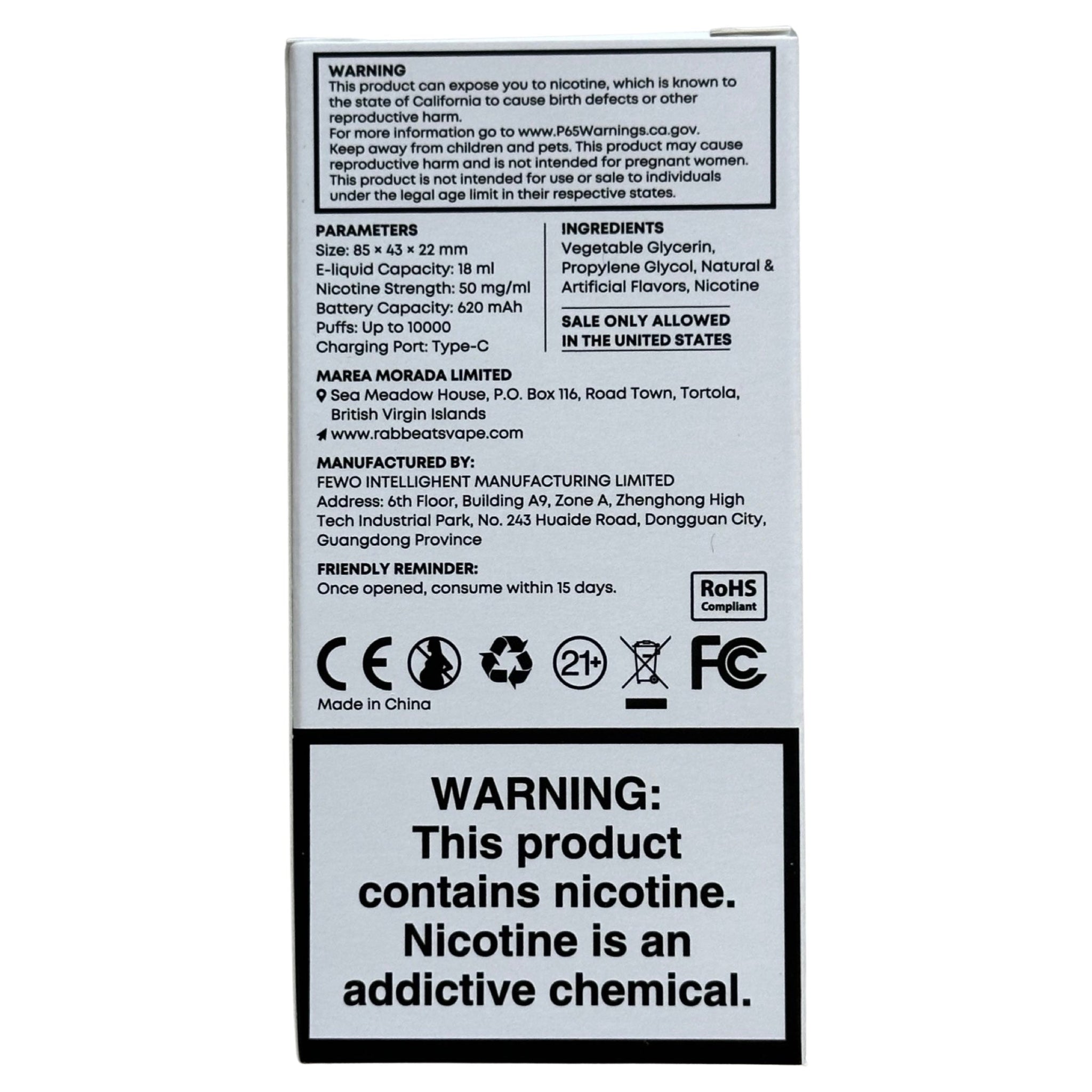 Behind the scenes, the RabBeats RC10000 boasts an 18ml e-liquid capacity, 50 mg/ml nicotine strength, and a powerful 620mAh battery.