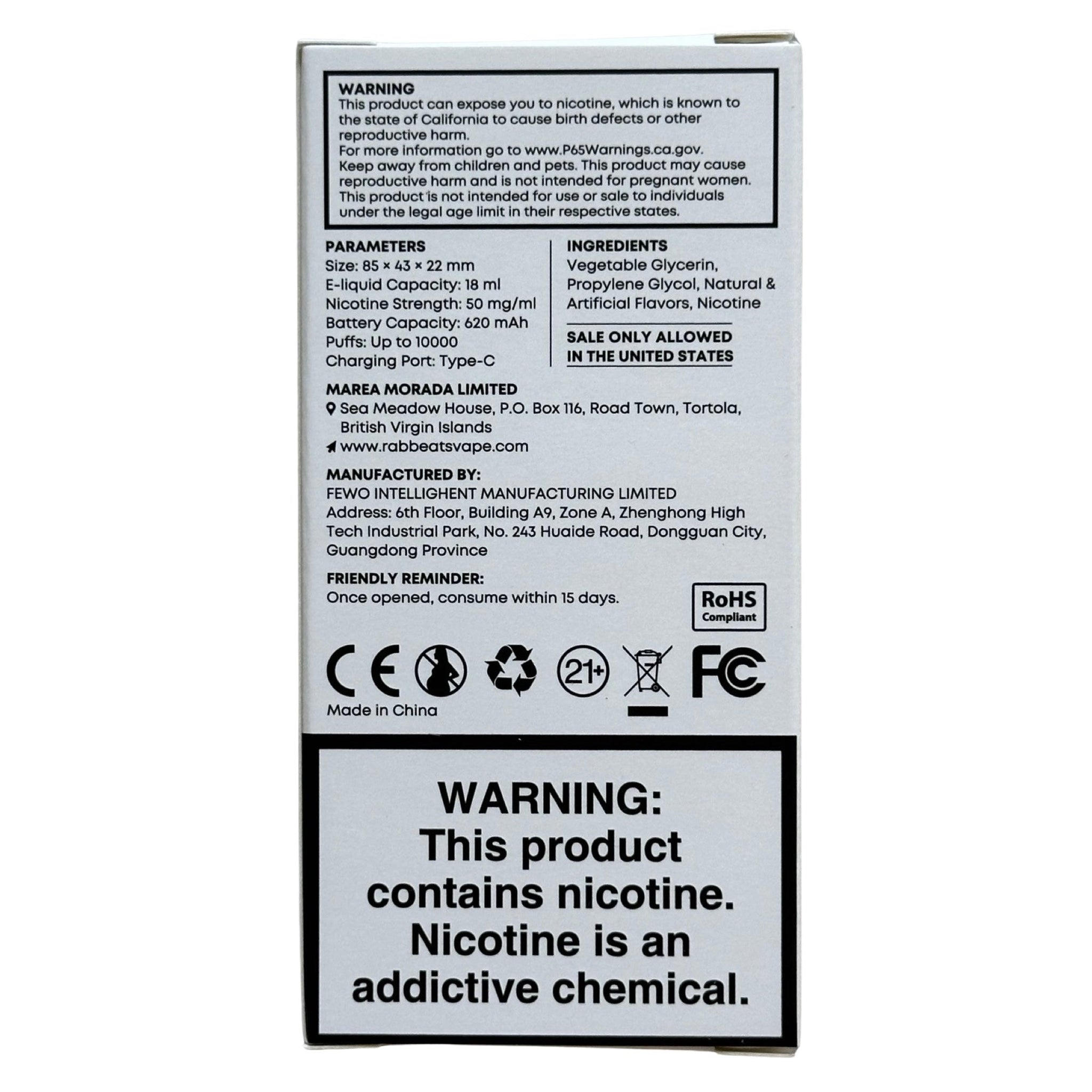 - Design Elegance. Beyond Taste, an Aesthetic Treat: The RabBeats RC10000 isn't just about flavor; it's a visual delight. This disposable vape, wrapped in a sleek, eye-catching design, adds a touch of elegance to your vaping collection. The attention to detail by Lost Mary extends beyond the flavor profile, making it a statement piece that complements your style.