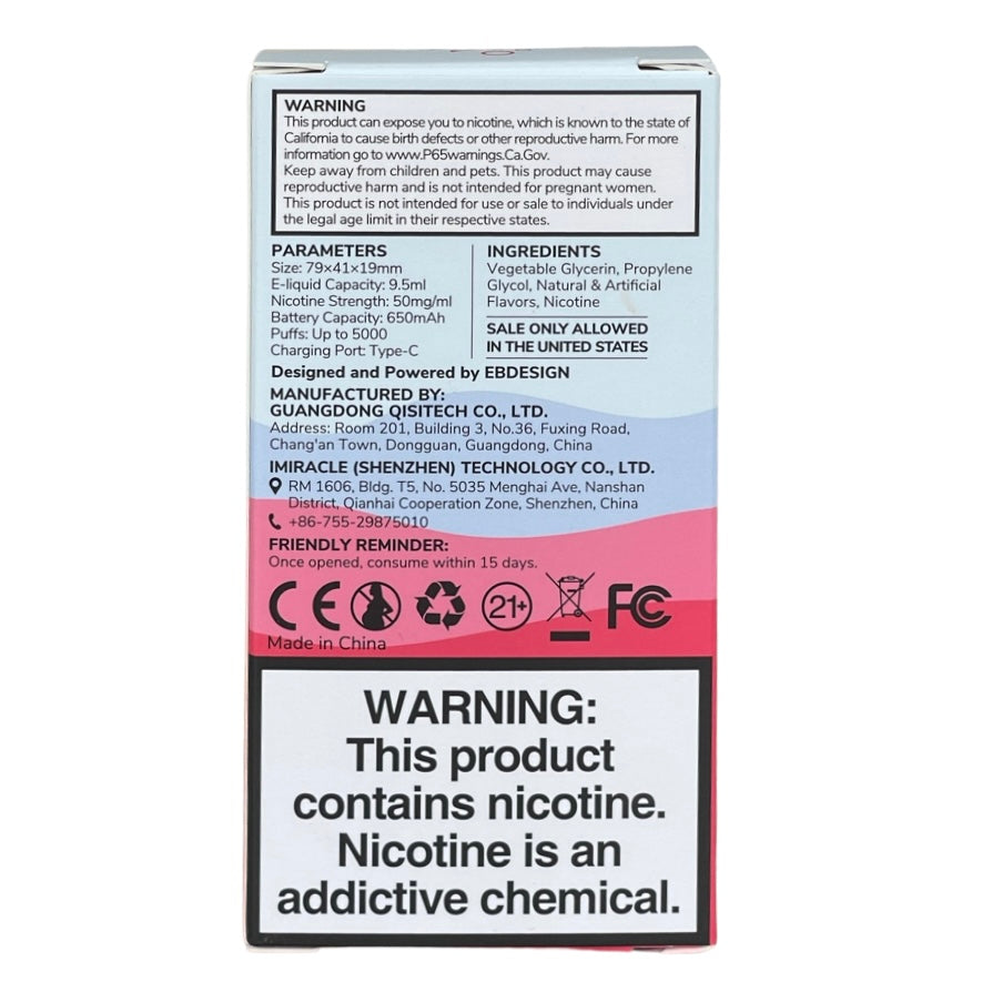 Each set includes 10 ml of e-liquid with 50 mg (5%) of nicotine, giving you up to 5000 draws from a single device. The battery can hold 650 mAh of energy and charges via a USB Type-C charging port. The Dual Coil ensures the best taste to enjoy your beach day with the EBC BC5000.