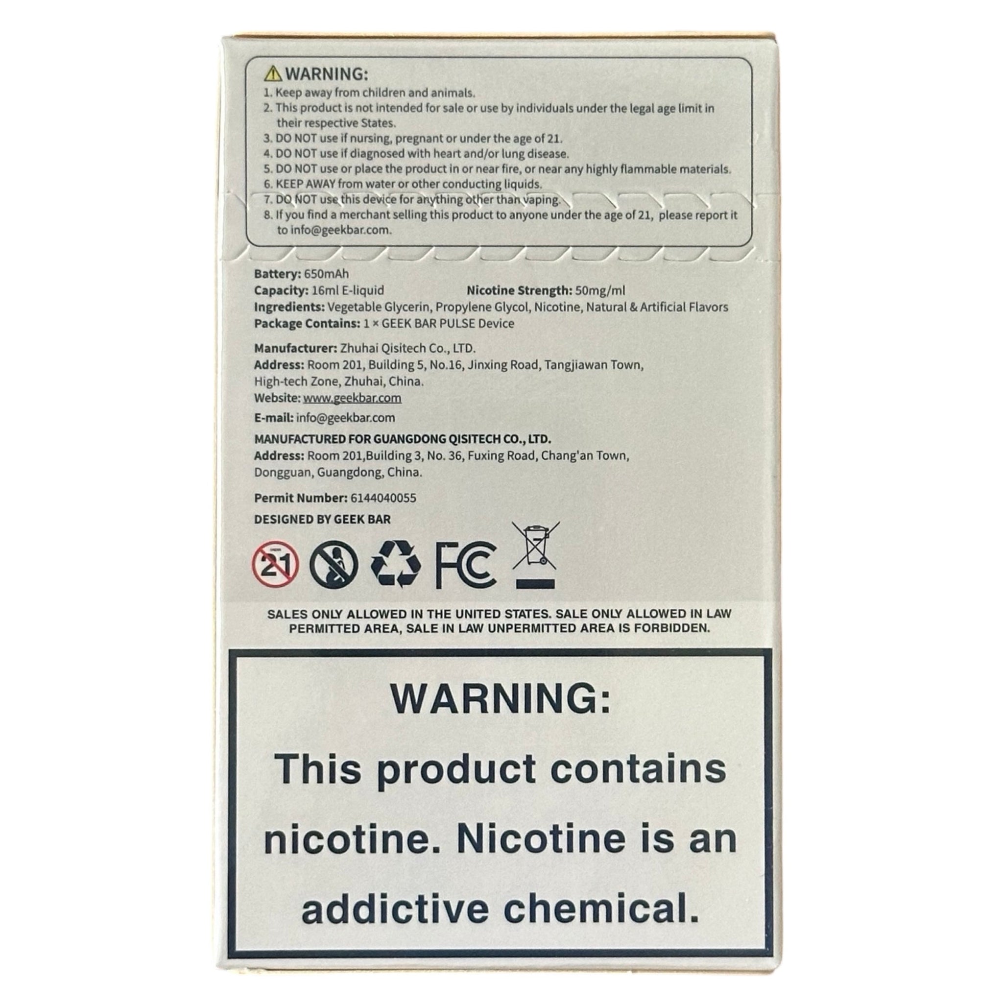 - What it Means: The e-liquid contents specify the volume of e-liquid the vape can hold. In this case, the Geek Bar Pulse 15000 can contain up to 16ml of e-liquid.