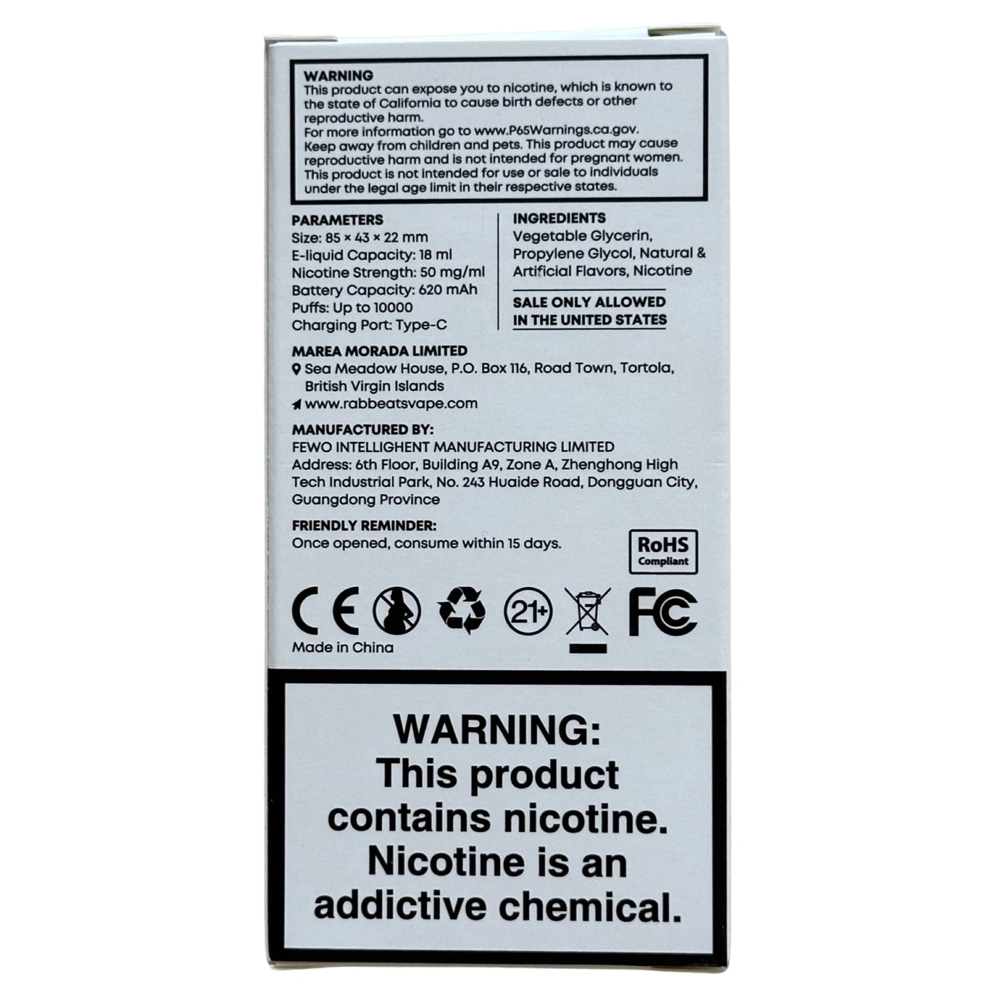 Under the hood, the RabBeats RC10000 is a powerhouse. Boasting an 18 ml e-liquid capacity, 50 mg/ml nicotine strength, and a robust 620 mAh battery, this disposable vape is not just about style – it's about substance. The Type-C charging port adds a modern touch, ensuring a speedy recharge for uninterrupted enjoyment.