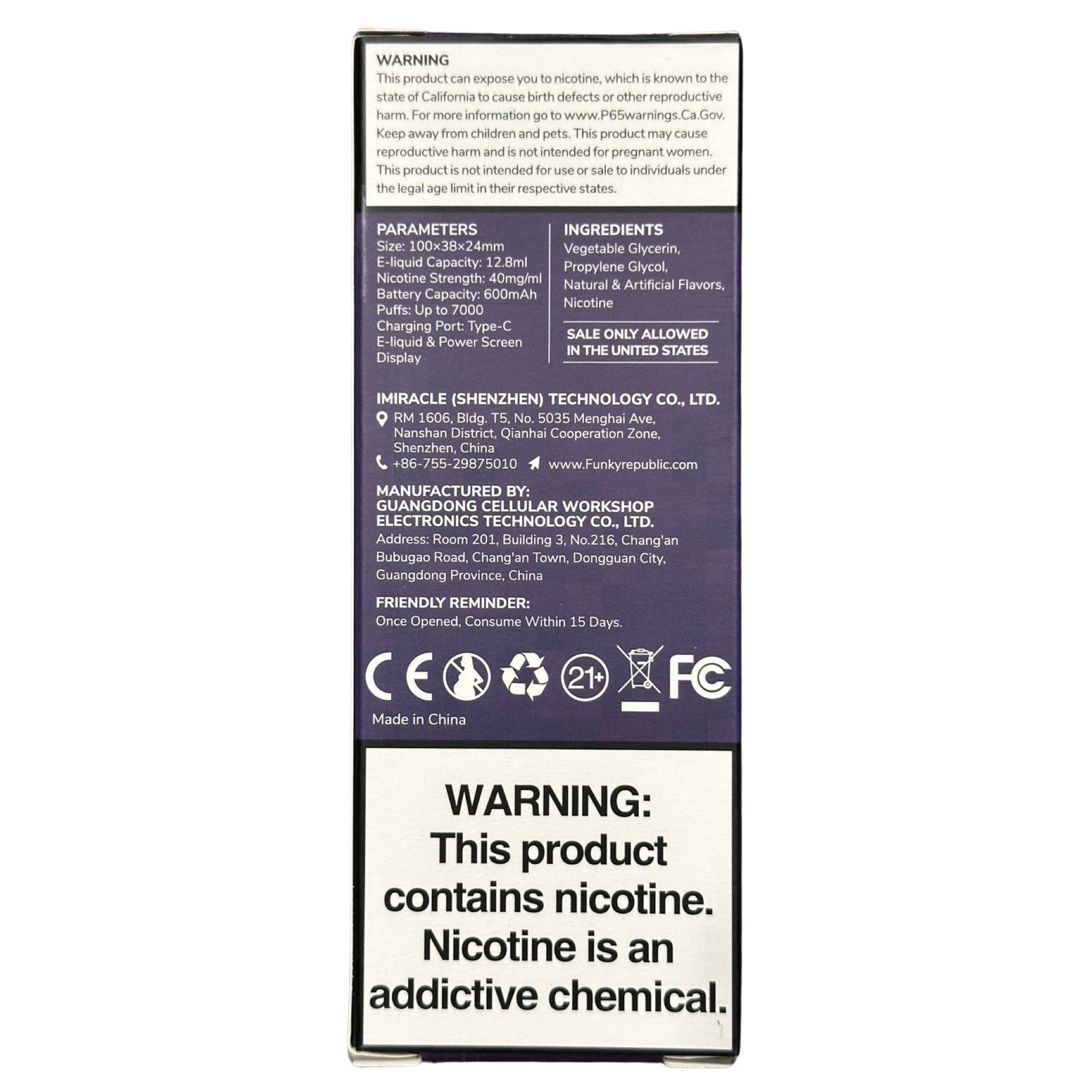 Let's talk about longevity. The Funky Republic Ti7000 is not your average disposable vape. With a whopping +7000 puffs per device, this vaping powerhouse ensures that the flavor fiesta keeps going and going.
