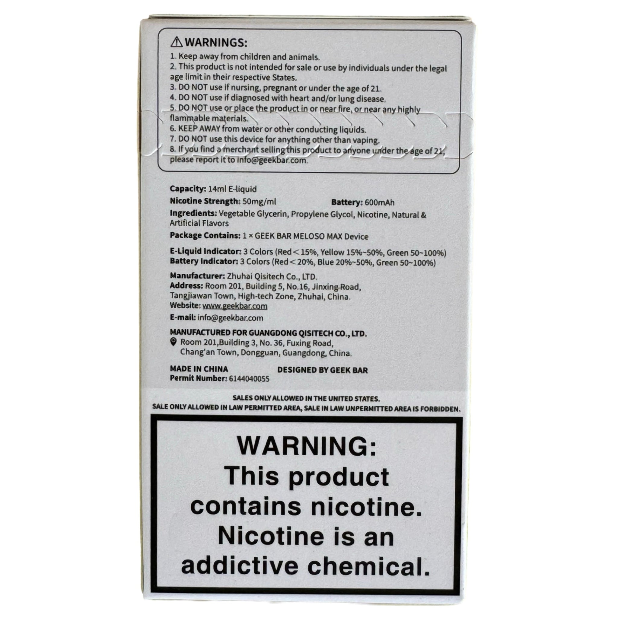 Crafted with precision and care, the Geek Bar Meloso Max 9000 features premium ingredients. Vegetable Glycerin and Propylene Glycol form the base, ensuring smooth vapor production and a satisfying throat hit. Natural and artificial flavors are meticulously blended to recreate the essence of a classic mojito, while 5% salt nicotine adds a punch to each inhale.