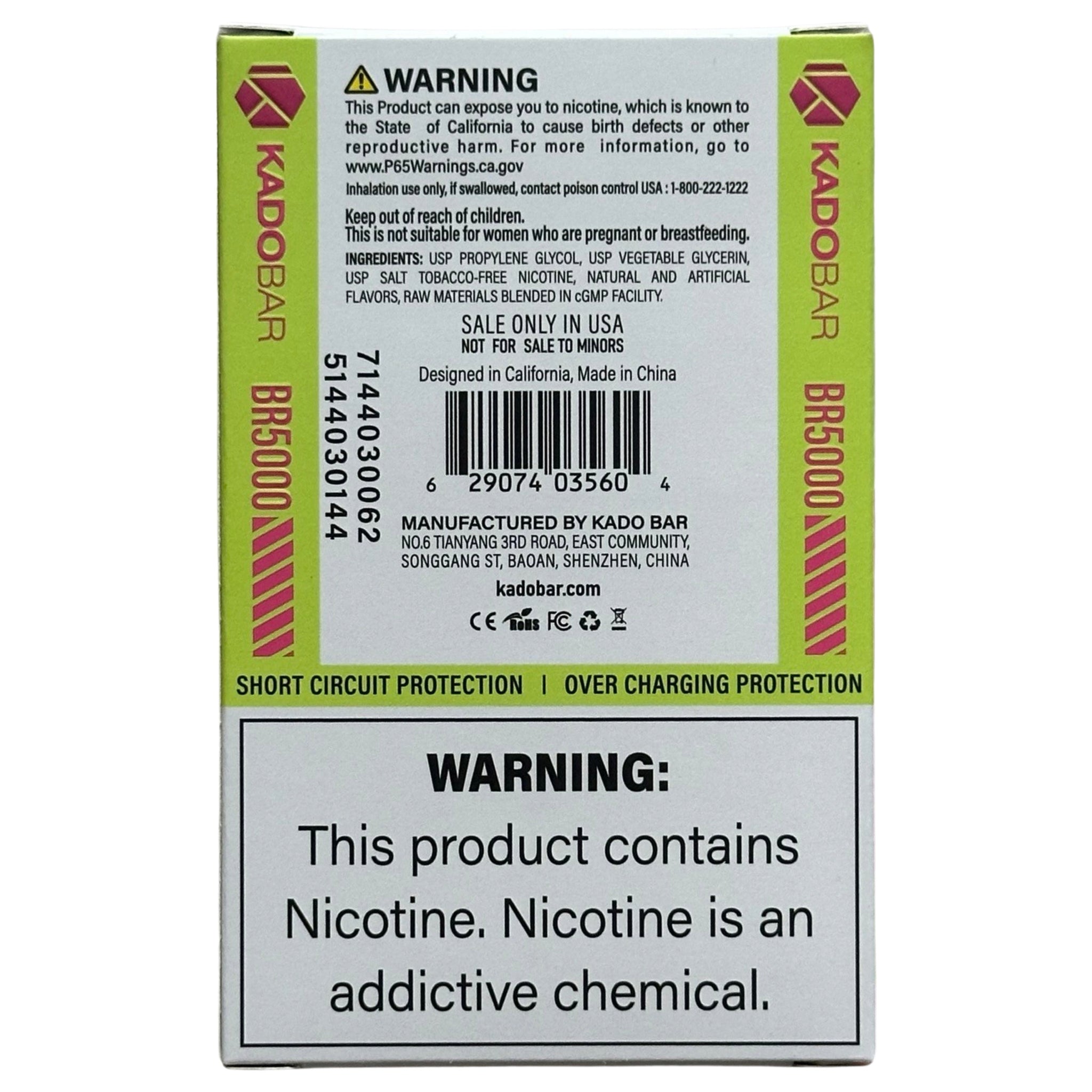- Natural & Artificial Flavors: The secret behind the Kado Bar BR5000's irresistible taste lies in its carefully curated blend of natural and artificial flavors. From the zesty sweetness of kiwis to the tartness of mixed berries, every note is perfectly balanced for a flavor explosion like no other.