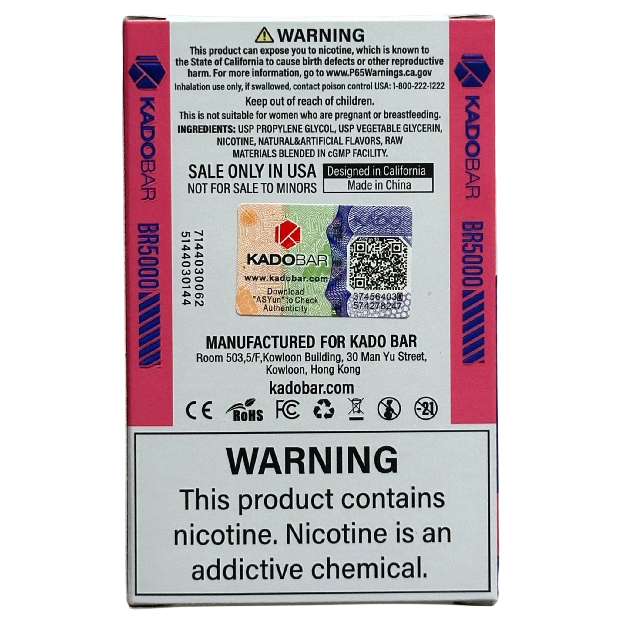 - Quality Assurance: When you choose the Kado Bar BR5000, you're choosing quality you can trust. Each device is carefully crafted using premium materials and undergoes rigorous testing to ensure durability, safety, and performance. You can vape confidently, knowing that your Kado Bar BR5000 is built to last and deliver exceptional results every time.