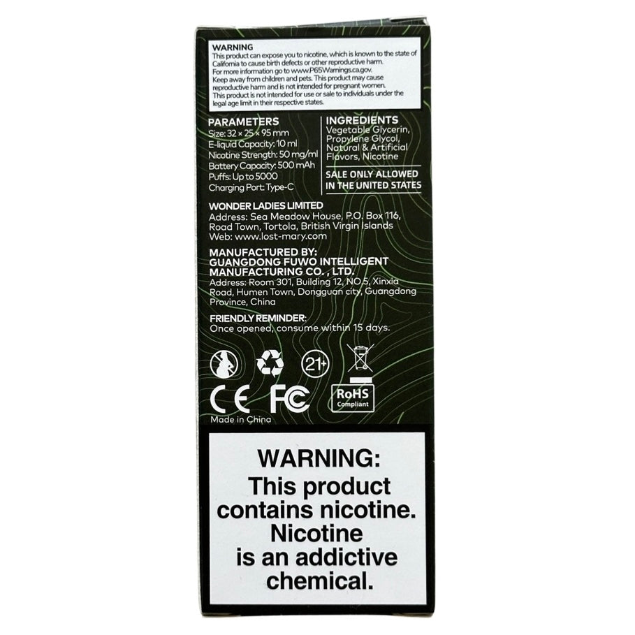 The MO5000 is more than just a functional vaping device; it's a style statement. With a sleek and ergonomic design, it sits comfortably in the hand and is easy to carry. Its minimalist aesthetic, combined with the bold branding of Lost Mary, ensures it stands out in a crowd, making it both a pleasure to use and to showcase.