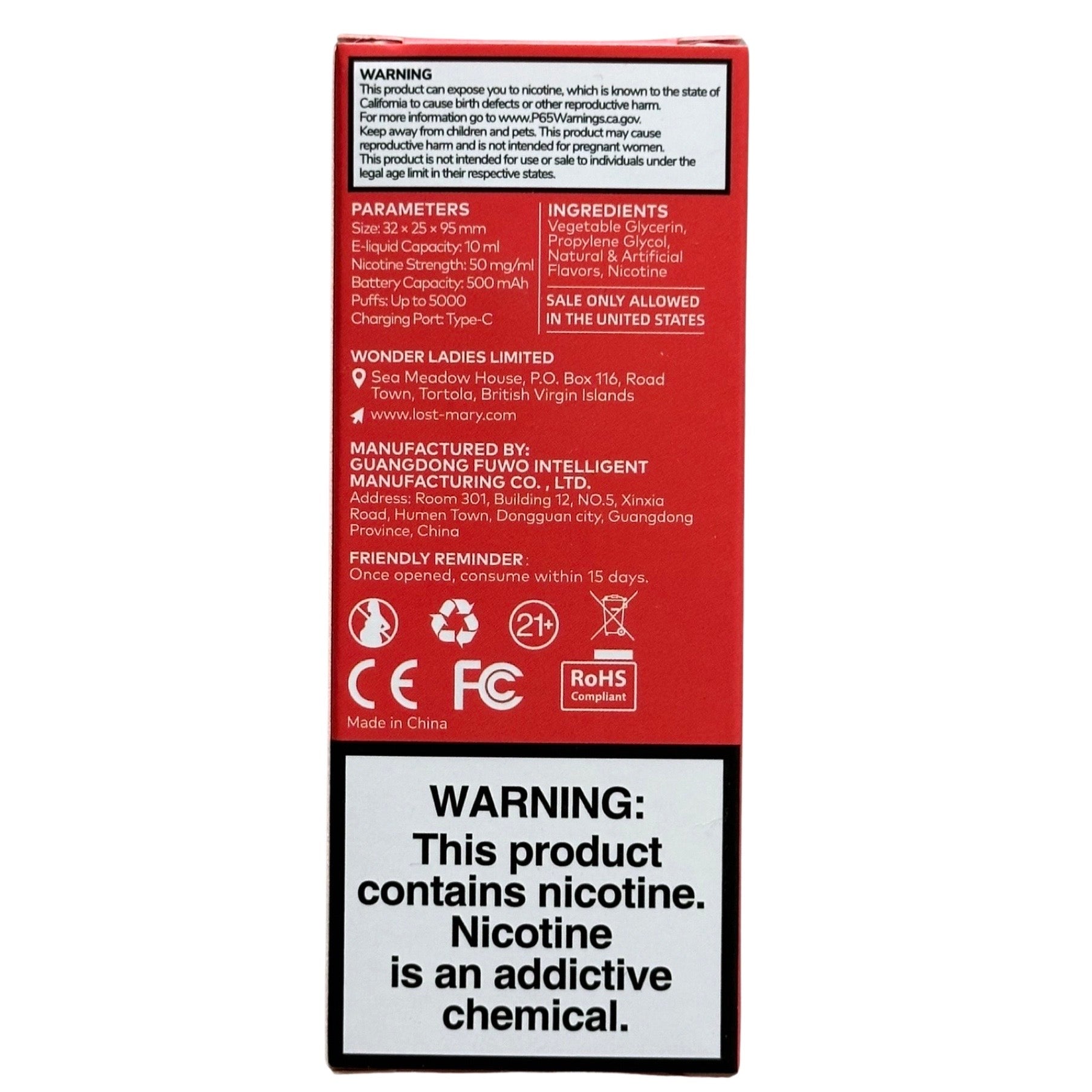 Equipped to deliver up to 5000 puffs, this device is designed for longevity and consistent performance. It contains a substantial 10 ml of e-liquid, ensuring that users can enjoy their vaping experience for an extended period without frequent refills. The Lost Mary MO5000 is perfect for those who prioritize both flavor and endurance in their vaping devices.