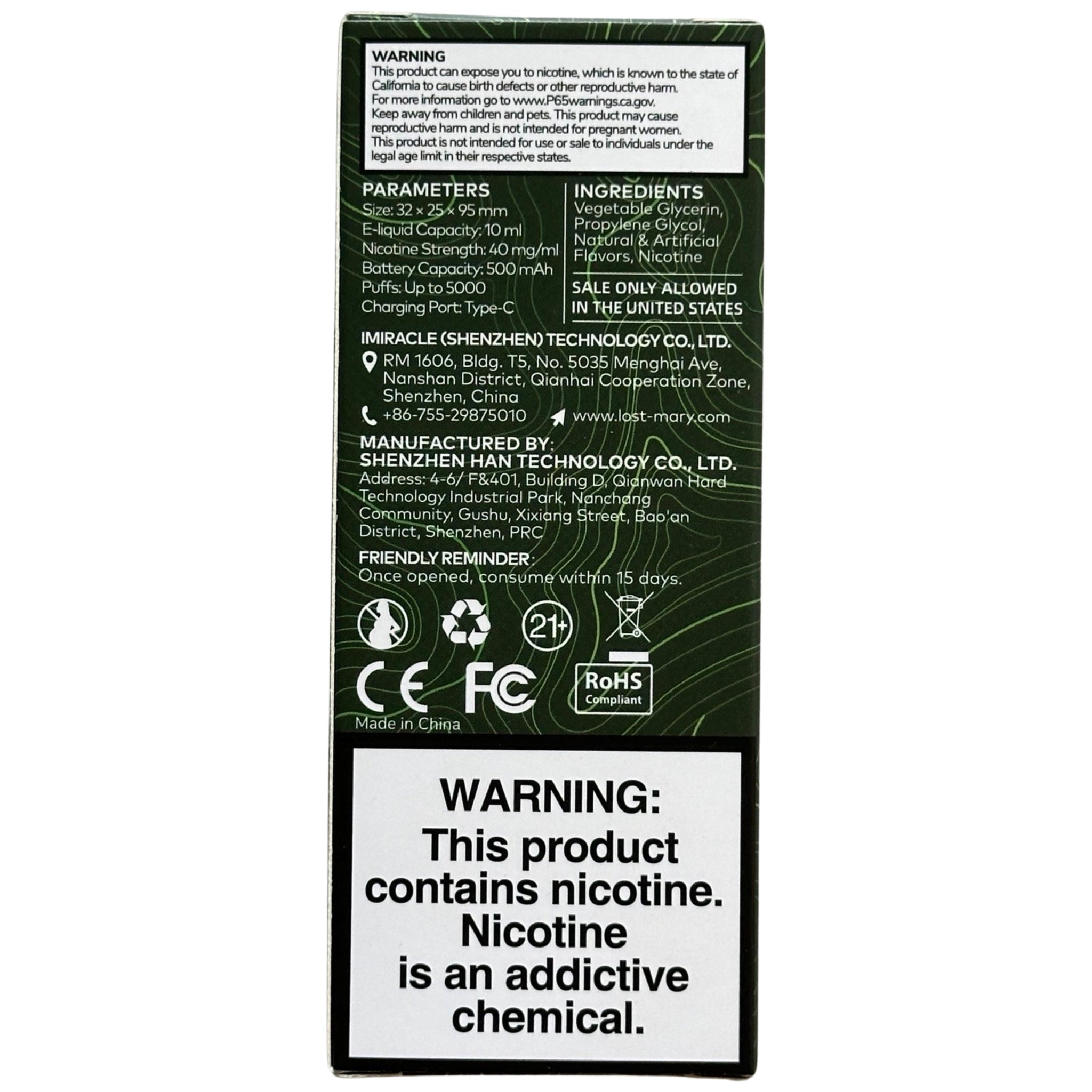 This model features a nicotine strength of 50 mg/ml, providing a satisfying and robust nicotine experience. It requires a Type-C charger for recharging, which is not included in the package. Users need to have a Type-C charger on hand to keep the device powered and ready for use.