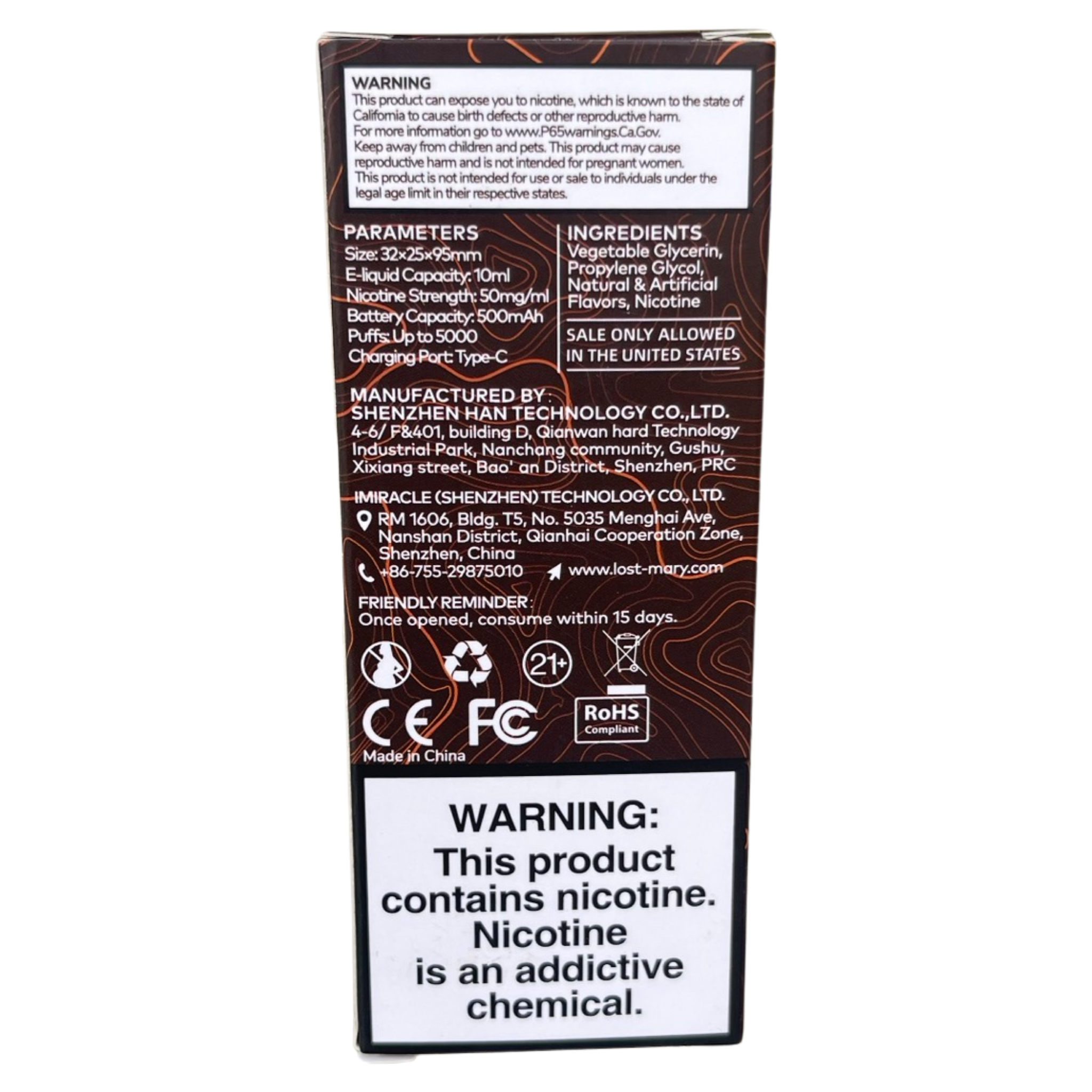 - Nicotine Level: Nicotine strength of 50mg/ml