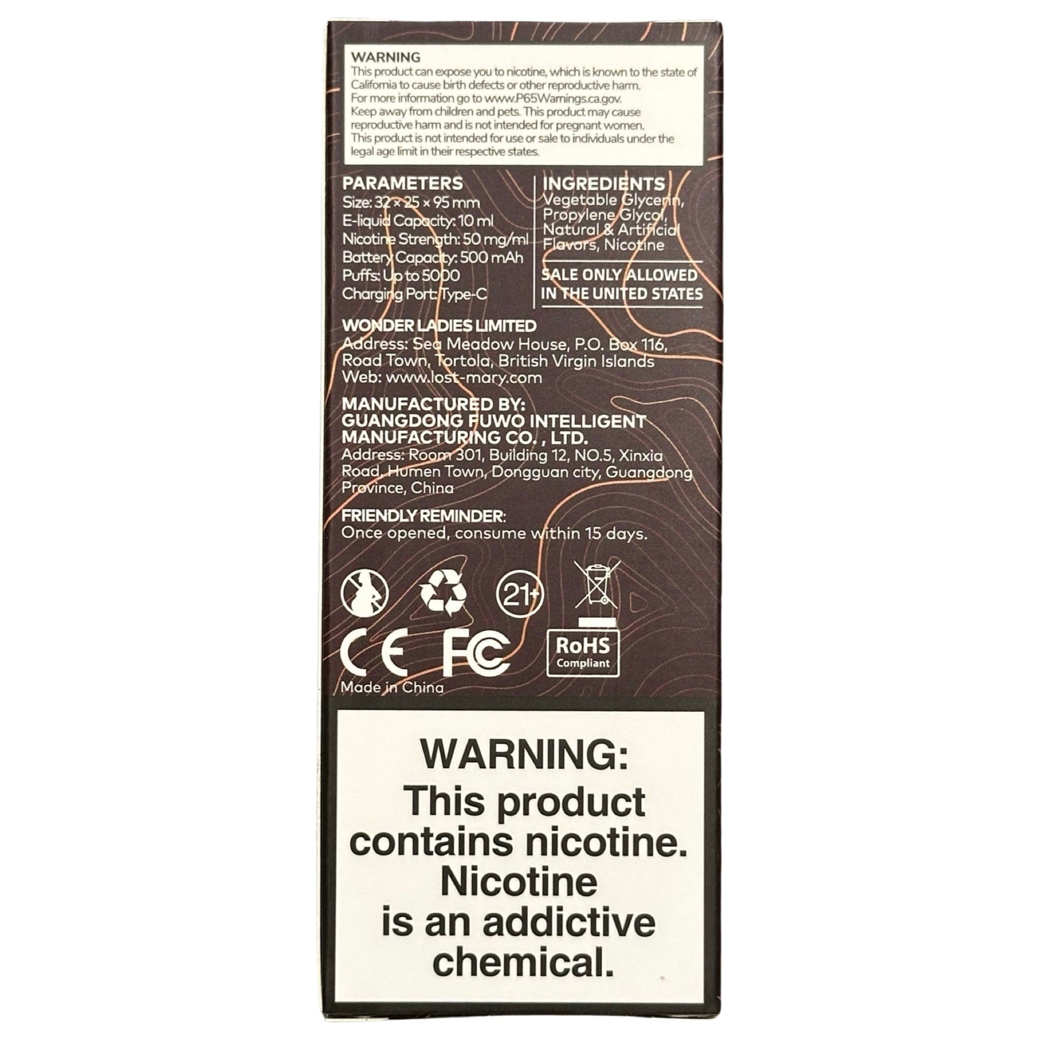 The Lost Mary MO5000 is formulated with a nicotine strength of 50 mg/ml, appealing to users who prefer a more potent nicotine experience. This concentration provides a strong throat hit and is particularly suitable for individuals transitioning from smoking or those who require a higher level of nicotine.