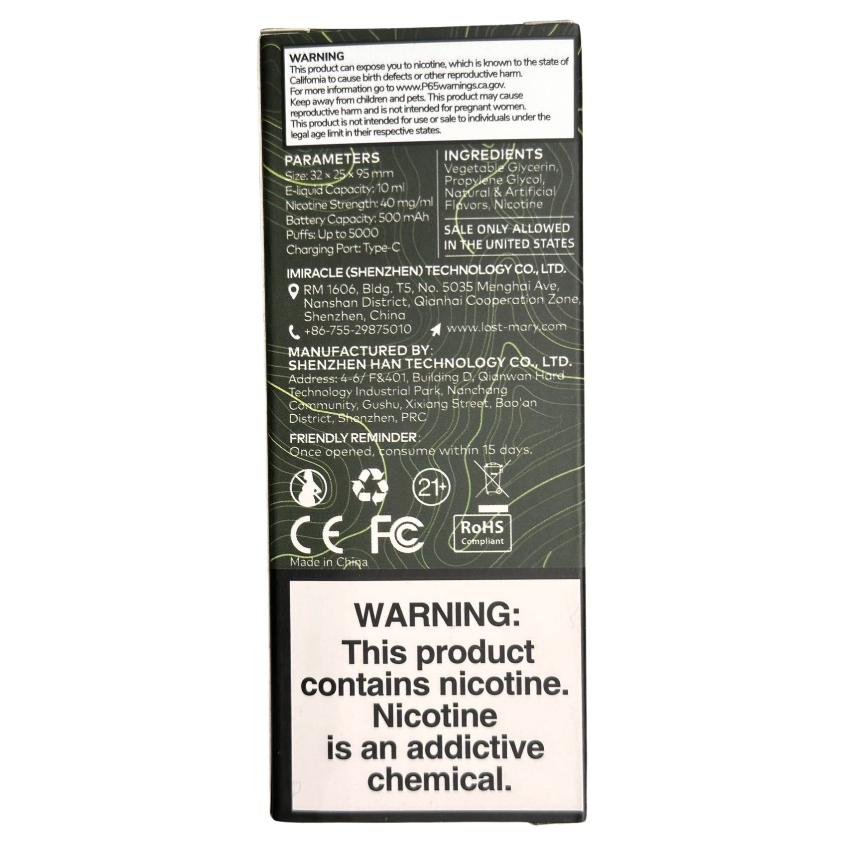 In conclusion, Lost Mary MO5000 Miami Mint stands as a remarkable e-liquid that combines the refreshingly cool flavor of mint with unwavering quality and captivating design. It offers an invigorating escape into an arctic breeze of minty freshness that redefines the pleasure of vaping. We invite you to experience the delightful fusion of flavor, quality, and design that Lost Mary MO5000 Miami Mint brings to your vaping journey. Welcome to a world of cooling bliss and a vaping experience like no other.