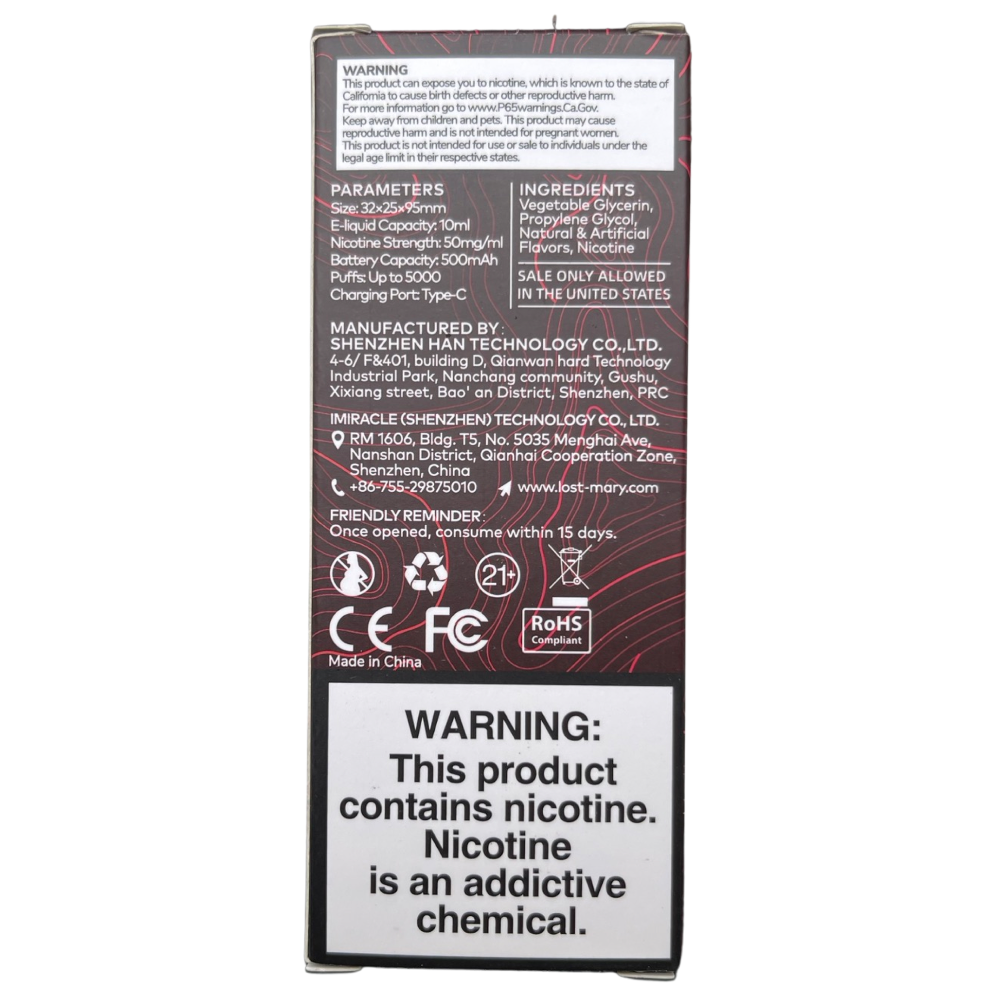The Watermelon Ice Lost Mary MO5000 features a powerful battery and a new mesh coil, ensuring a rich flavor and dense clouds of vapor until the last puff. The device boasts excellent components that combine a quality rechargeable battery and a large puff capacity, enhancing the overall vaping experience.