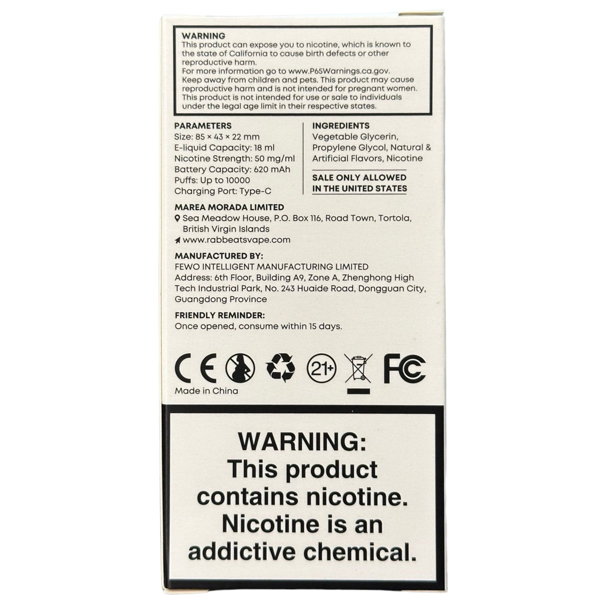 - Nicotine Strength (50 mg/ml): For those who crave a bold and robust nicotine hit, RabBeats RC10000 delivers a 50 mg/ml strength. Elevate your vaping experience with the perfect balance of flavor and satisfaction.