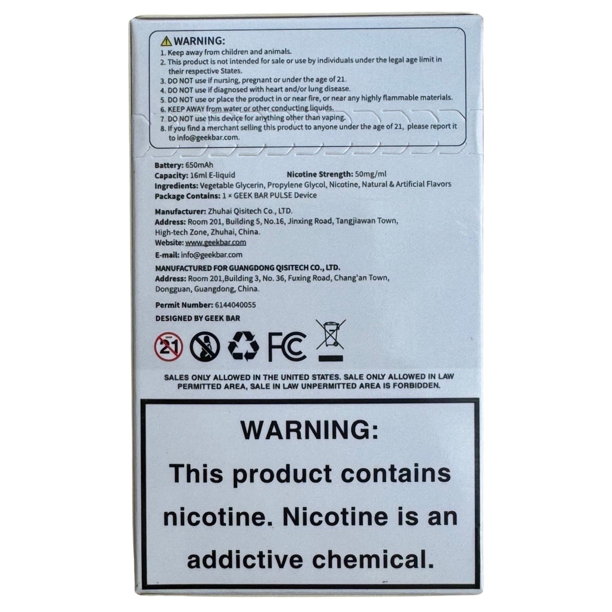 - Choice of Nicotine Level: Catering to diverse preferences, the Geek Bar Pulse 15000 offers a nicotine level of 50mg, delivering a satisfying hit with every puff. Whether you're a seasoned vaper craving a bold throat hit or a newcomer exploring the world of vaping, this vape provides the perfect balance of flavor and nicotine satisfaction. Say goodbye to cravings and hello to satisfaction with every inhale.