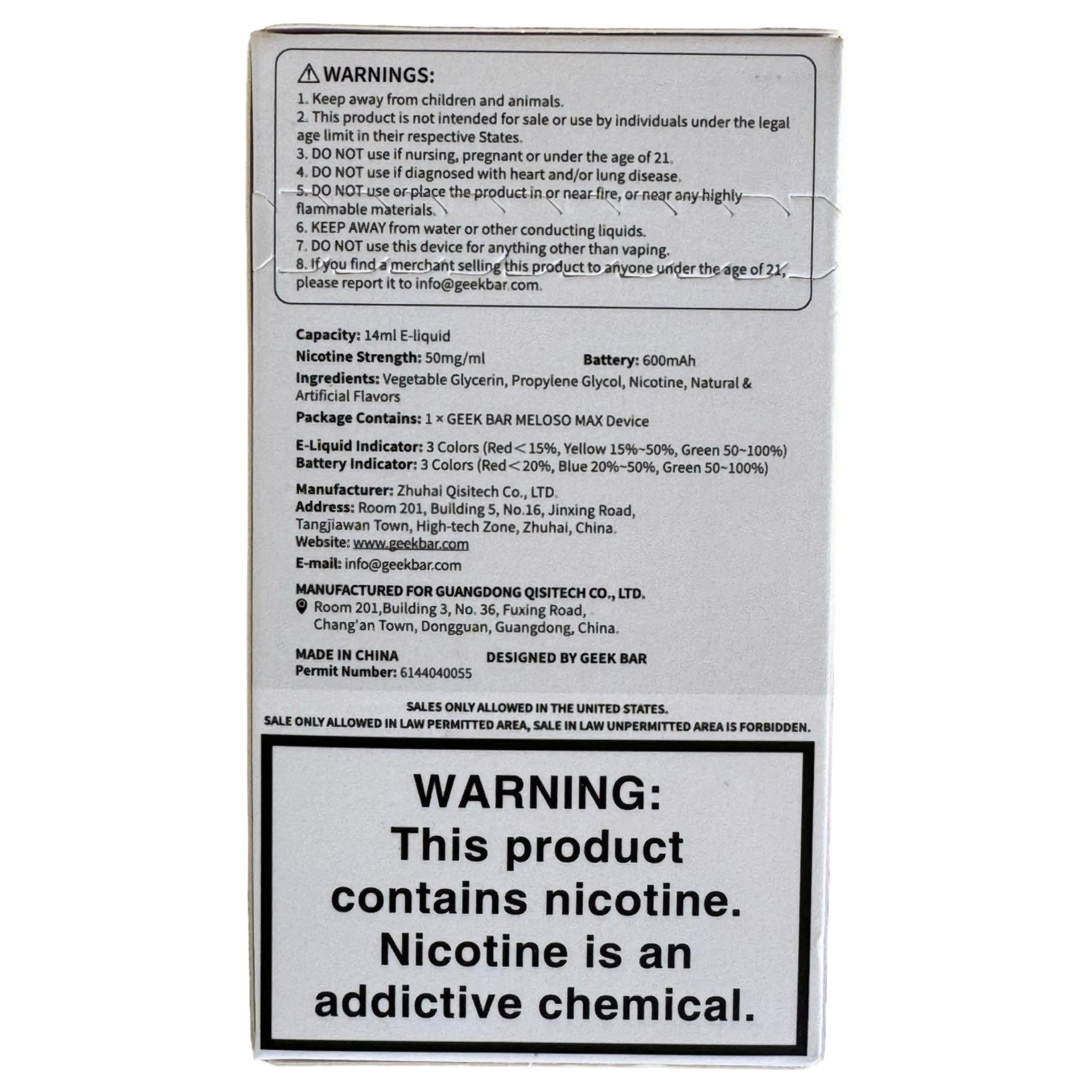 Crafted with care and precision, the e-liquid filling the Geek Bar Meloso Max 9000 is a symphony of flavors designed to ignite your senses. Made from the finest ingredients, including vegetable glycerin, propylene glycol, and natural and artificial flavors, every inhalation is a journey into vaping perfection. With 5% salt nicotine content, indulge in smooth and satisfying throat hits that keep you coming back for more.